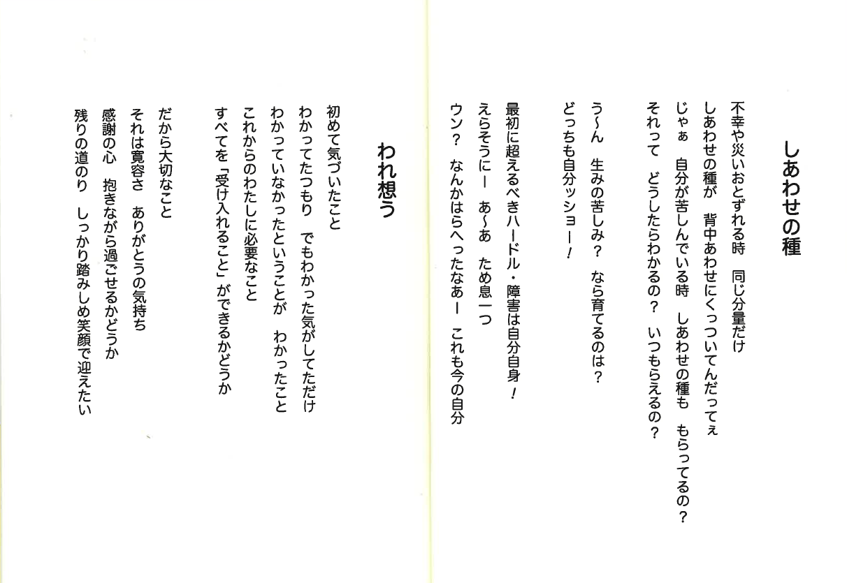 さまざまな活動に意欲的に取り組まれており、先日、ご自身で執筆された書籍と詩集をクリニックにお持ちくださいました。中でも詩の作品は特に心を打つもので、「ブログに掲載してもよい」と快くお言葉をいただきましたので、今回ご紹介させていただきます。