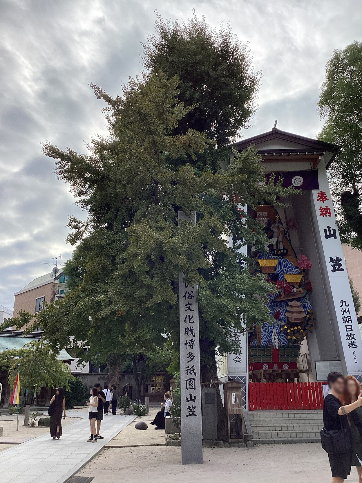 境内の飾り山笠の左側には3本のイチョウが合体した「夫婦ぎなん」と呼ばれる御神木があり、こちらも樹齢300年以上と言われています。雄と雌の木が根本から寄り添うように伸びていることから、夫婦円満のシンボルとされているそうです。