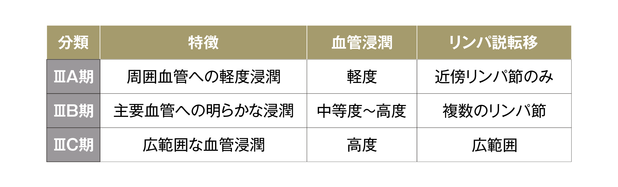 ステージ3は血管浸潤の程度とリンパ節転移の状況により、さらに細かく分類されます。