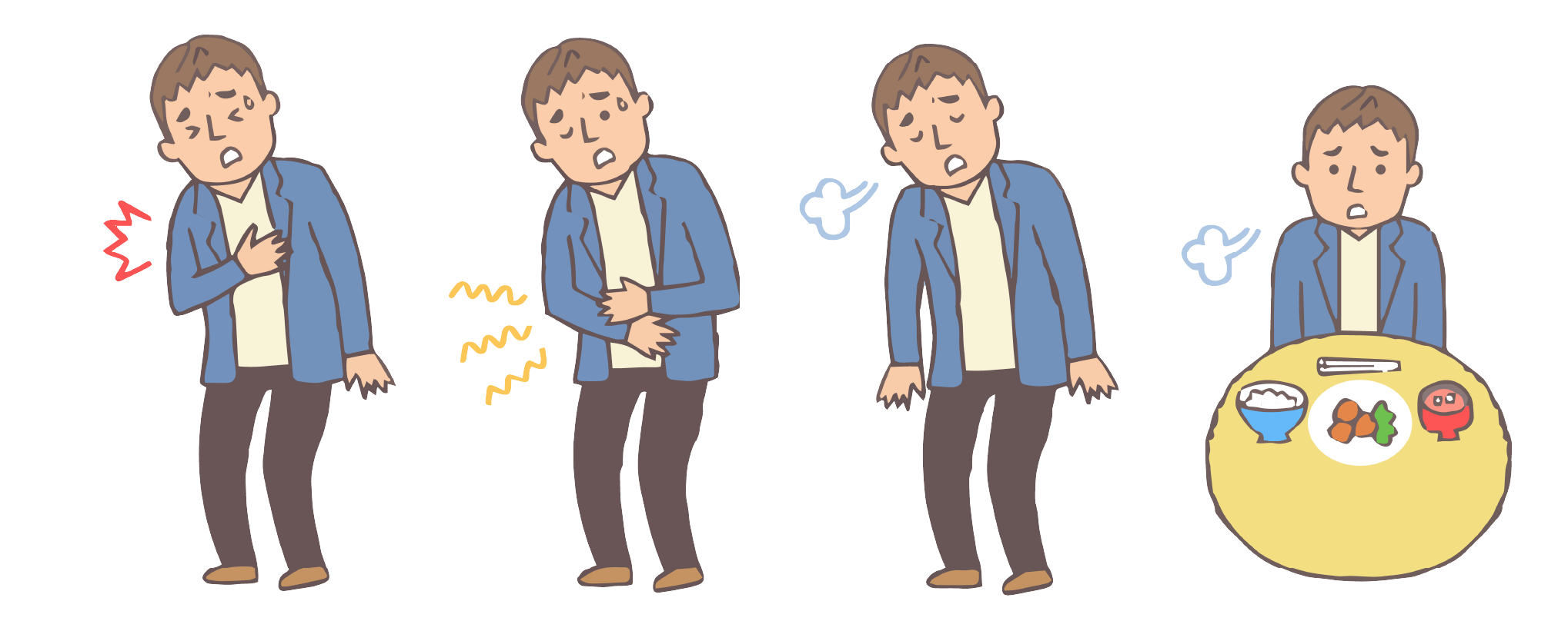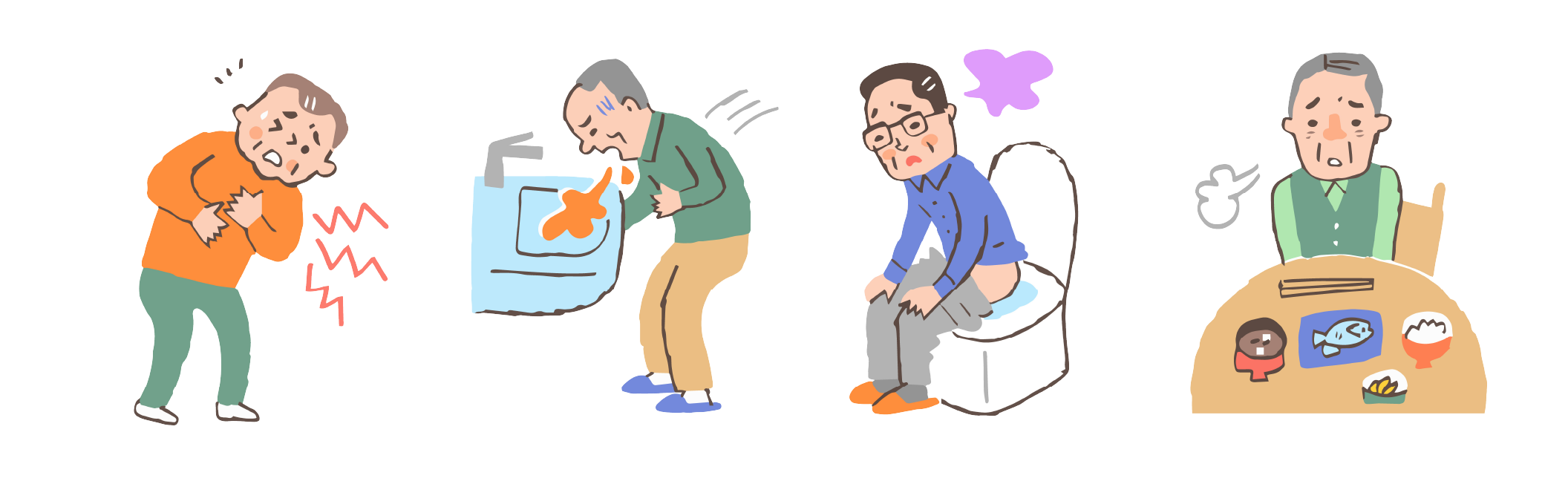 腫瘍が十二指腸や胃を圧迫することで、食べ物の通過が妨げられ、吐き気や嘔吐が現れます。また、膵液分泌の低下により脂肪の消化が困難になり、脂肪便(白っぽく油のような便)が見られることがあります。食後の胃もたれや腹部膨満感も一般的な症状です。