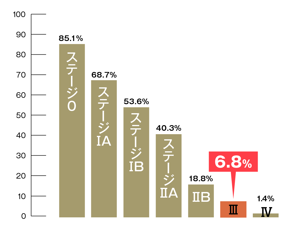ステージ3A期では約15%、ステージ3B期では約8%、ステージ3C期では約5%という報告があります。