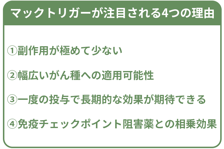 研究段階の報告によれば、マックトリガーと免疫チェックポイント阻害薬(例:抗PD-1抗体)を組み合わせて使用することで、相乗的な効果が得られる可能性が示唆されています。