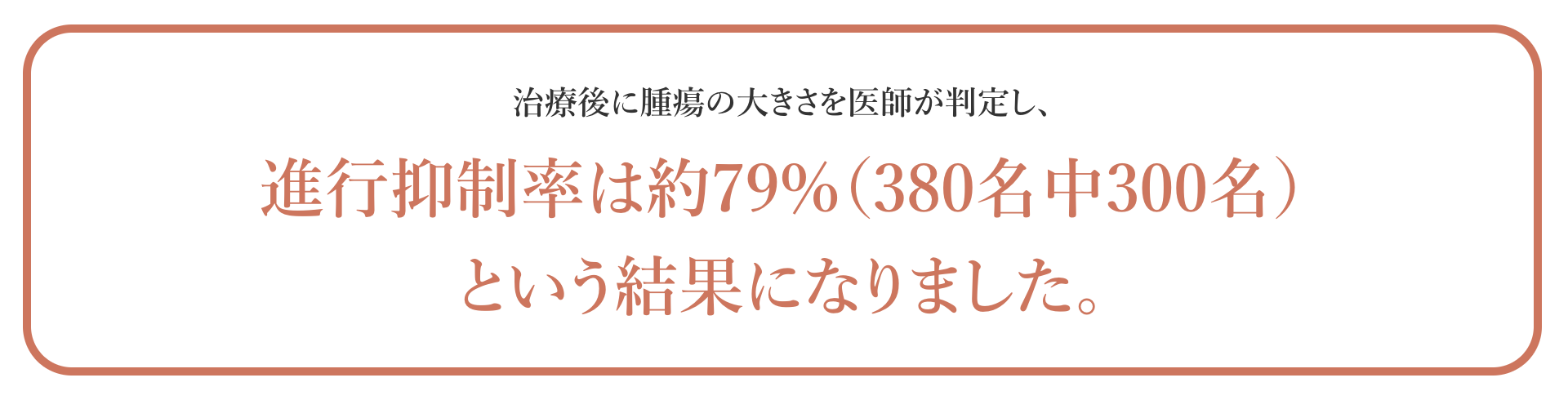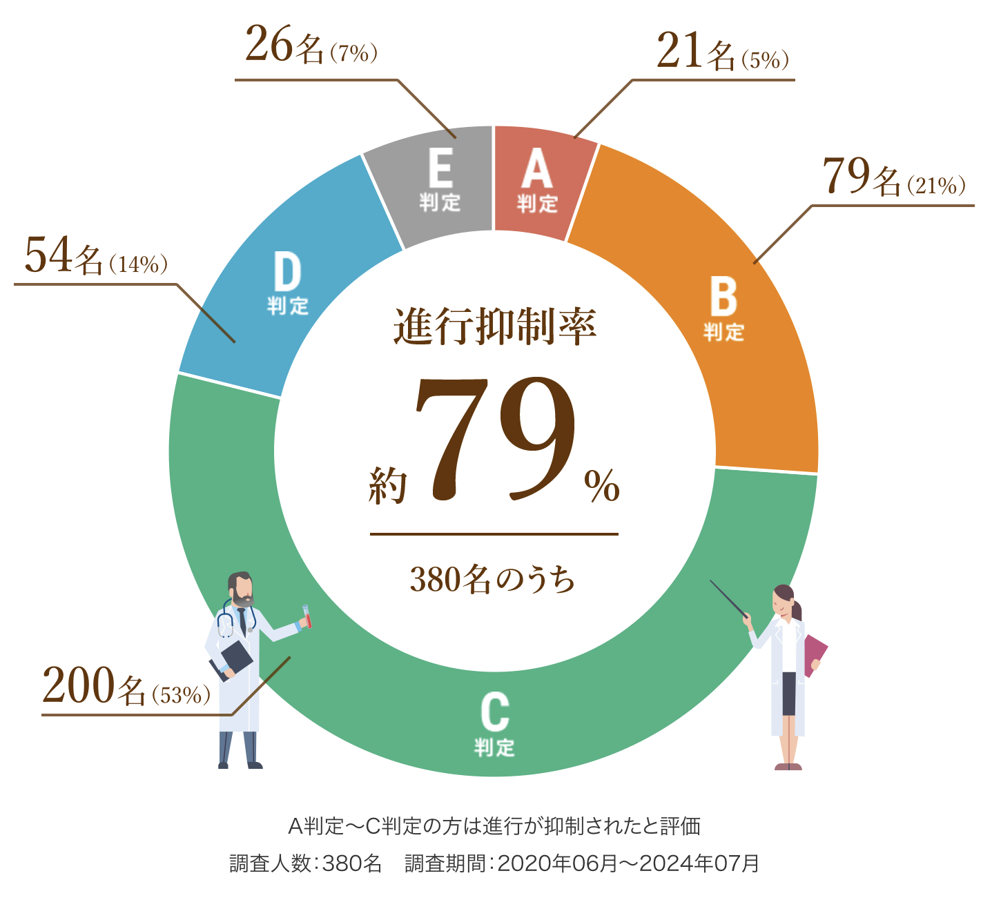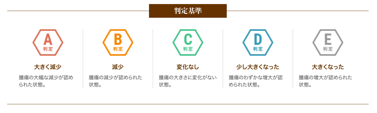 A判定〜C判定の約79%の方は腫瘍の進行が抑制されたと評価し、さらにA判定〜B判定の約26%の方は腫瘍の減少が認められた状態となりました。